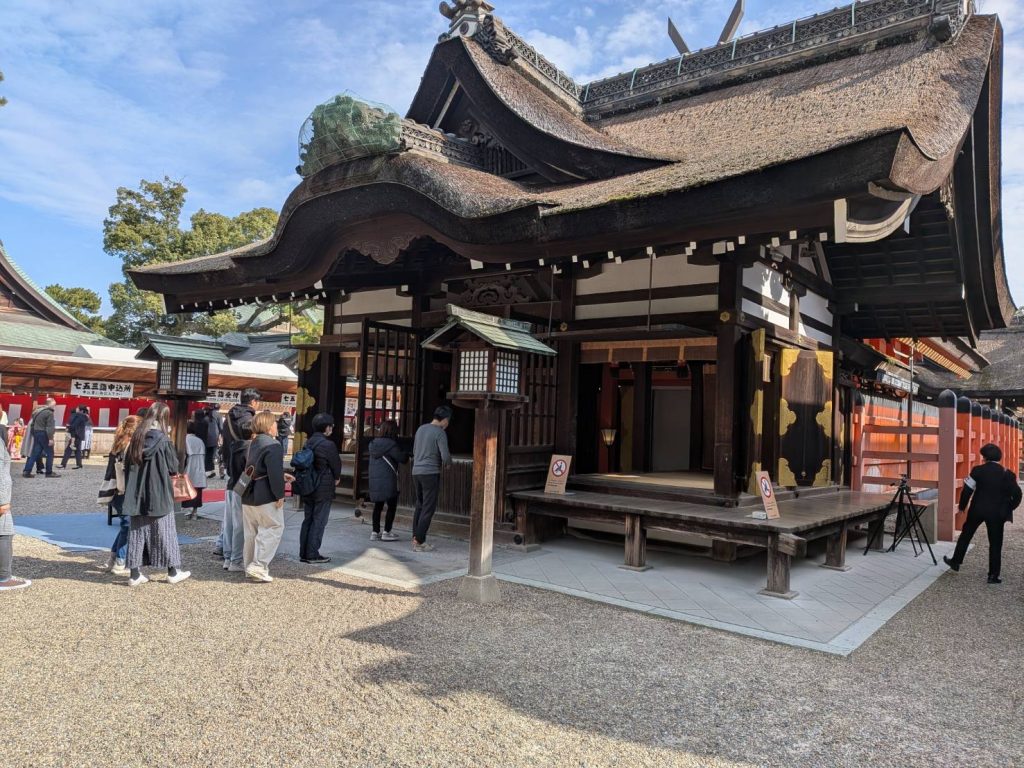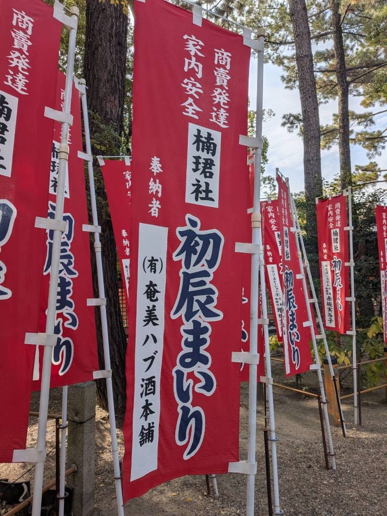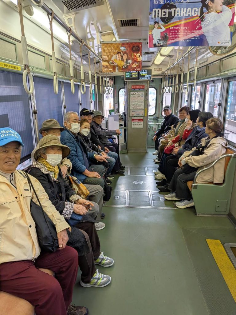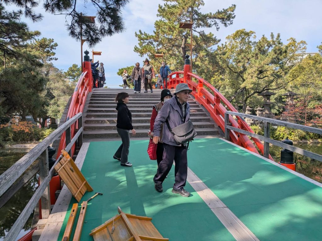 貸し切り状態のレトロな路面電車で、下関市の住吉神社・福岡市の住吉神社ともに「三大住吉」の一つに数えられる住吉大社へ、行列に並んでまでお参りする信心深いメンバー、神前結婚式の行列に遭遇「お幸せに」、それから、なんと我が島奄美からの初振(発達)まいりの幟を発見、奇遇を感じる。