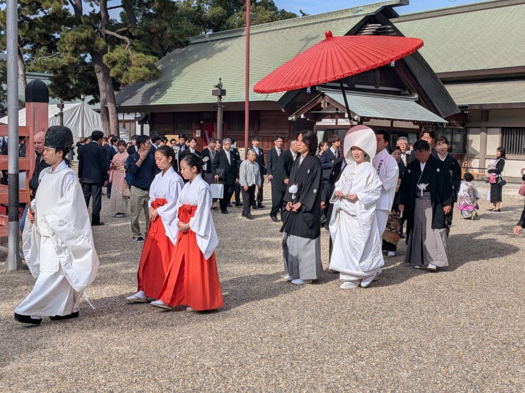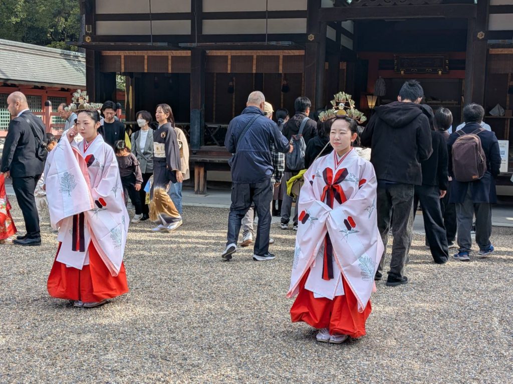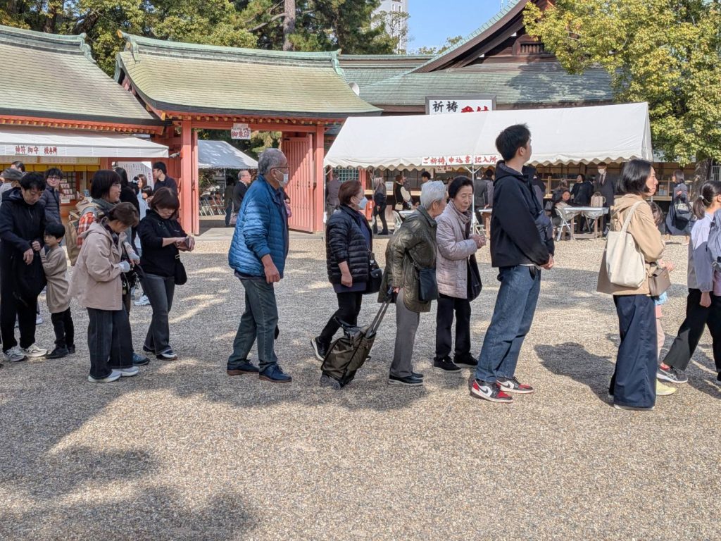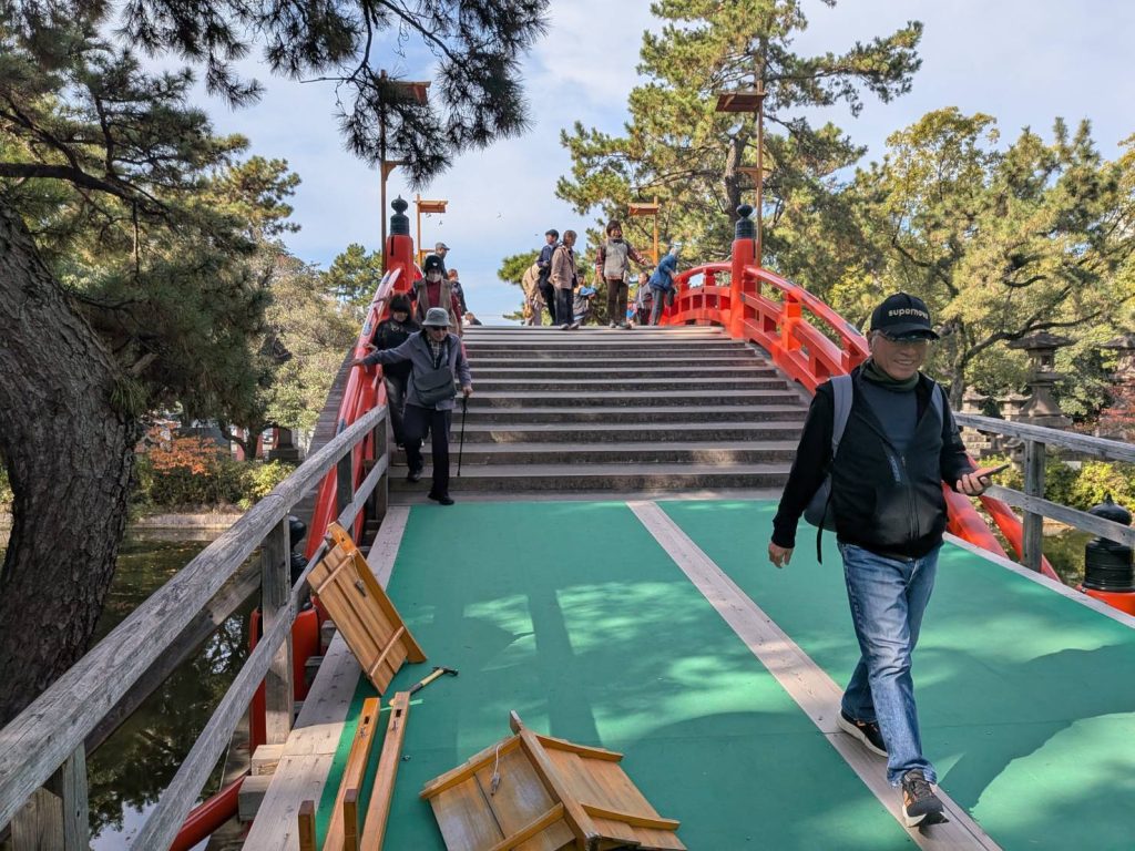 貸し切り状態のレトロな路面電車で、下関市の住吉神社・福岡市の住吉神社ともに「三大住吉」の一つに数えられる住吉大社へ、行列に並んでまでお参りする信心深いメンバー、神前結婚式の行列に遭遇「お幸せに」、それから、なんと我が島奄美からの初振(発達)まいりの幟を発見、奇遇を感じる。