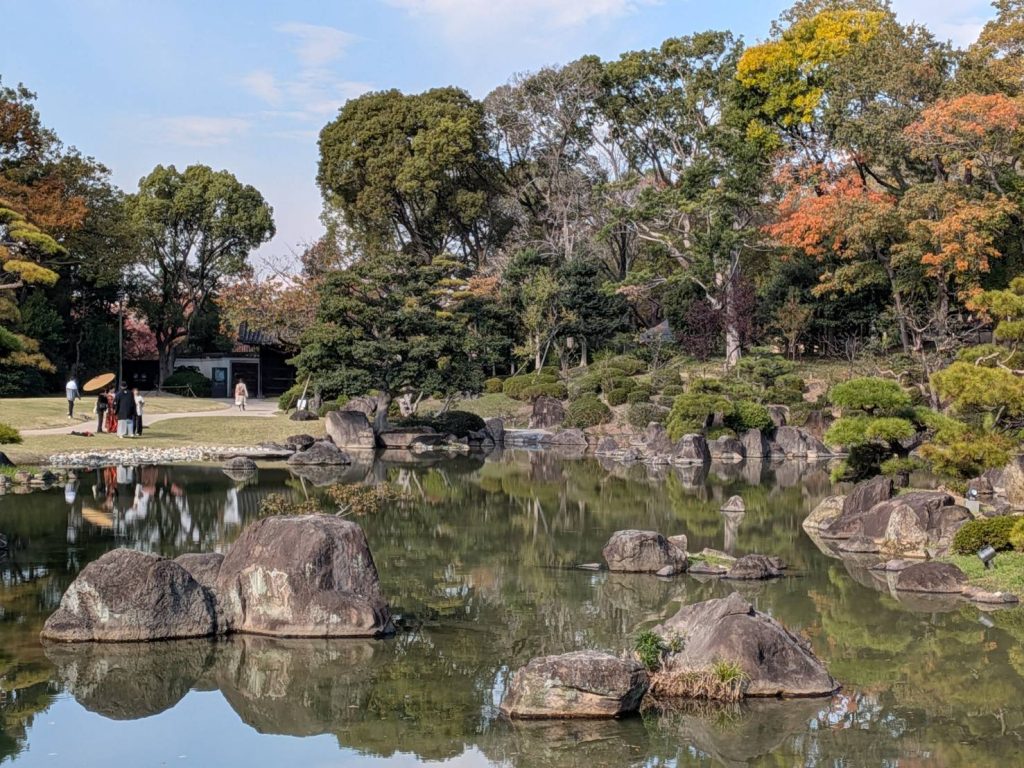 食後に、昭和元年に住友財閥から大阪市へ寄贈された日本庭園 慶沢園(けいたくえん) をゆったり散策、観光地の喧騒とは無縁の静けさの中で、あべのハルカスを背景に集合写真を撮影。